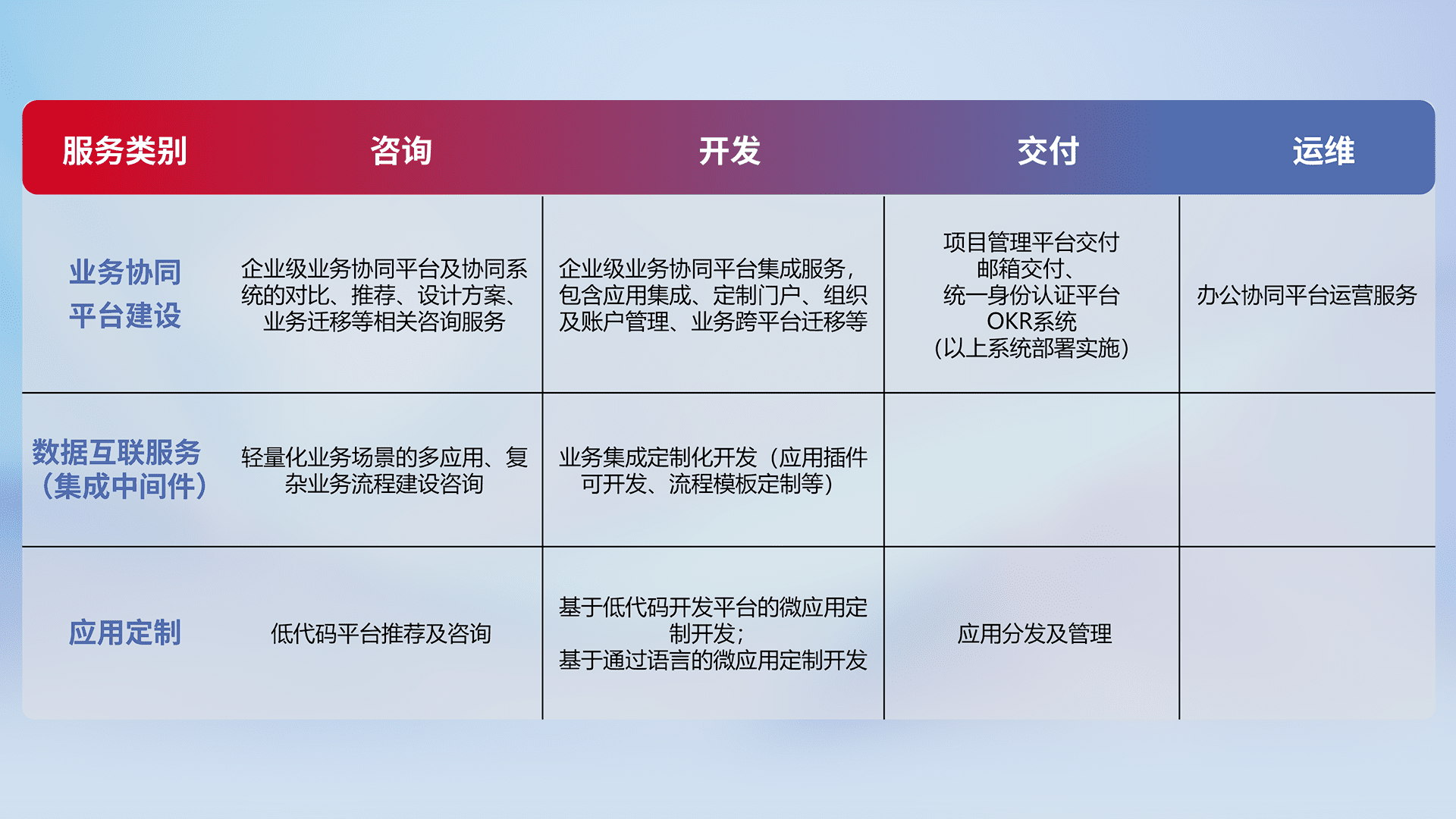 针对钉钉、、、、企微、、IDaas等平台级产品提供产品的规划、、方案、、、、交付、、、定制化开发等服务,,,实现如统一协同办公、、、、智能客户服务、、、、混合会议管理、、、智能数据查询、、等业务场景,,,实现数字化转型。。。。